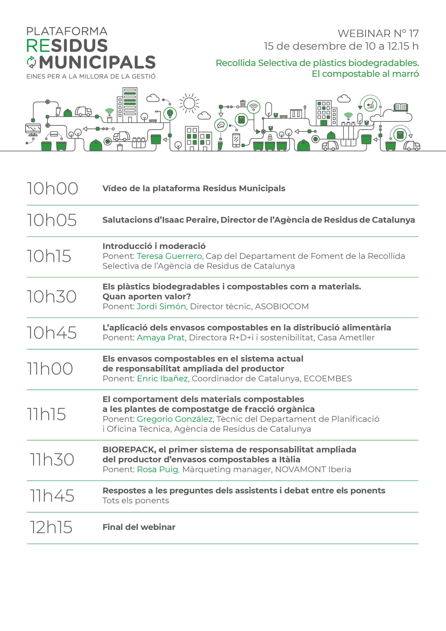 Organitzat per les entitats que conformen la Plataforma de Residus Municipals, aquest passat dijous 15 de desembre ha tingut lloc el WEBINAR Nº 17. Recollida selectiva de plàstics biodegradables. El compostable al marró.