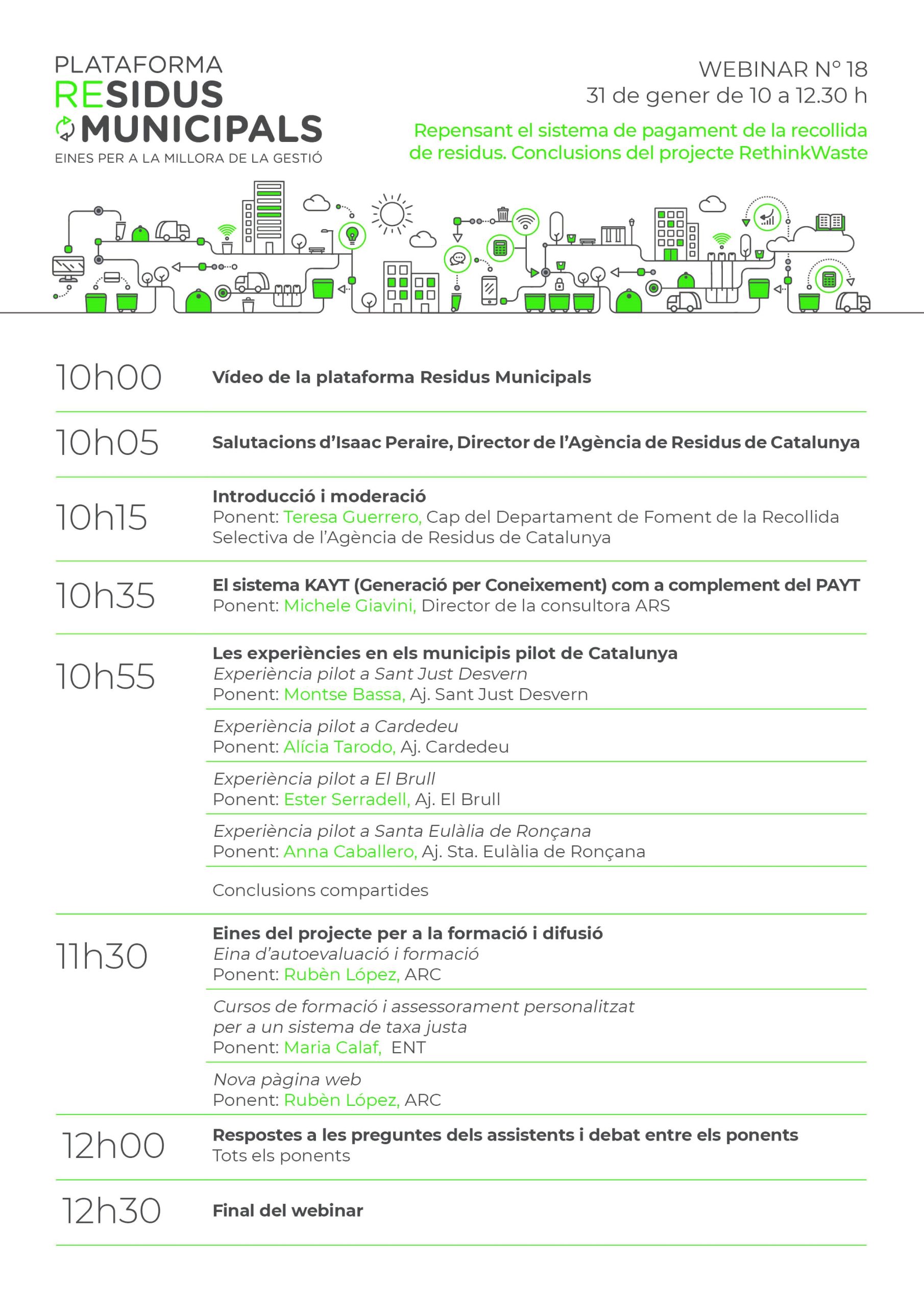 Organitzat per les entitats que conformen la Plataforma de Residus Municipals, ahir dimarts 31 de gener va tenir lloc el WEBINAR Nº 18. Repensant el sistema de pagament de la recollida de residus. Conclusions del projecte REthinkWASTE.